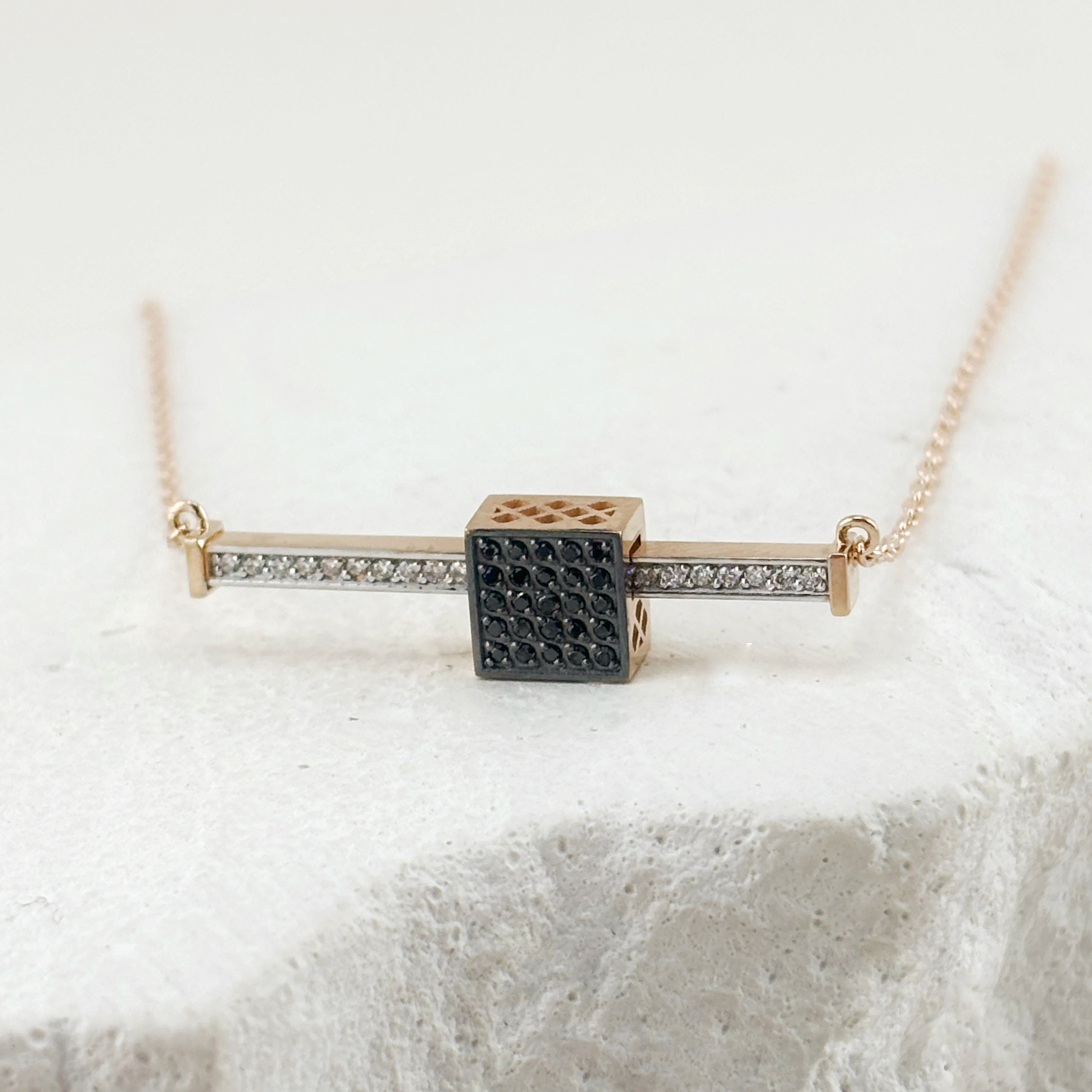 Объемные кубы и плоские квадраты, украшенные бриллиантовыми дорожками. Строгий минимализм отлично впишется в вечерний архитектурный стиль.