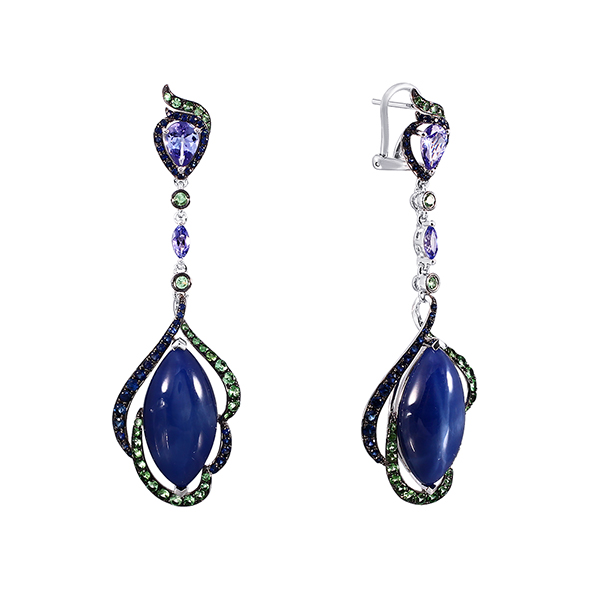 Серьги с сапфирами, танзанитами и цавторитом из белого золота 585 пробы арт. ER-35148