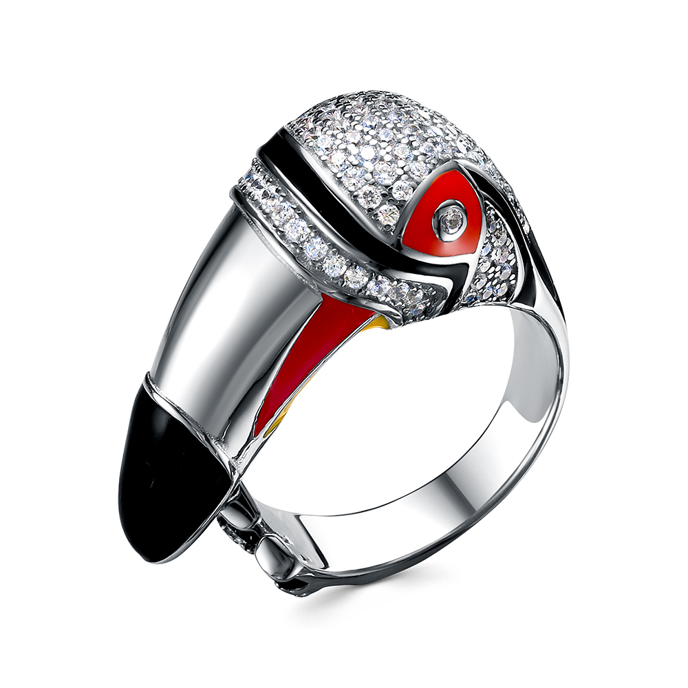 Кольцо "Тукан" с фианитами и эмалью из серебра 925 пробы арт. HPR4076_KO_ENAM_WG