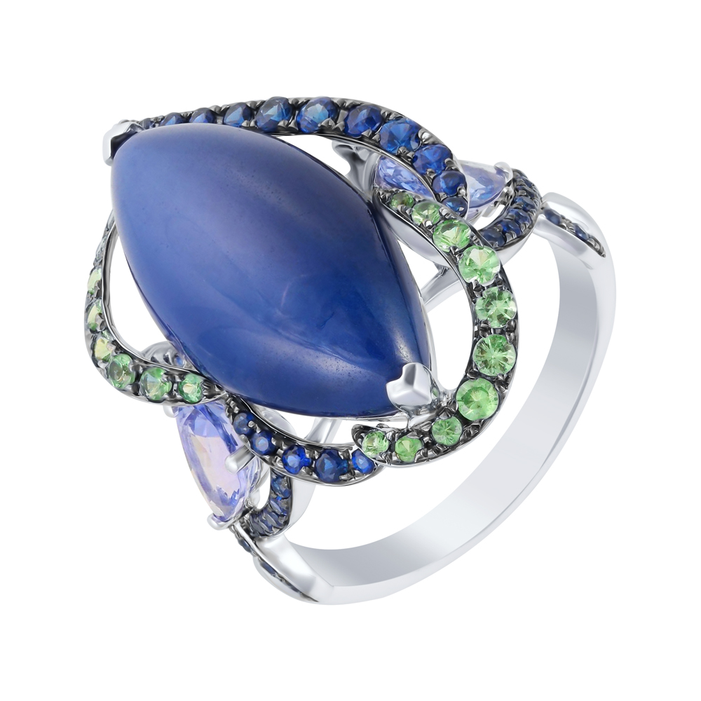 Кольцо с сапфирами, танзанитами и цаворитом из белого золота 585 пробы арт. RG-35148
