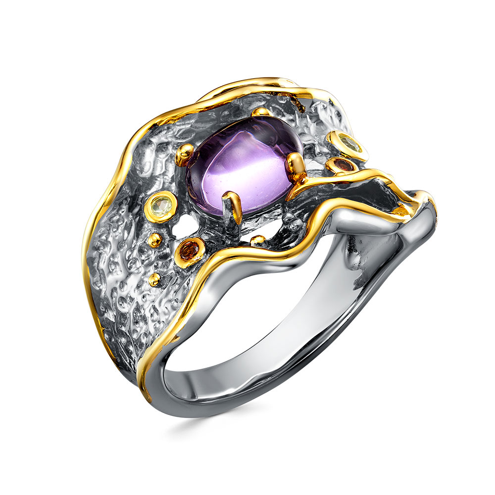 Кольцо с аметистом, перидотом и гранатами из серебра 925 пробы с позолотой