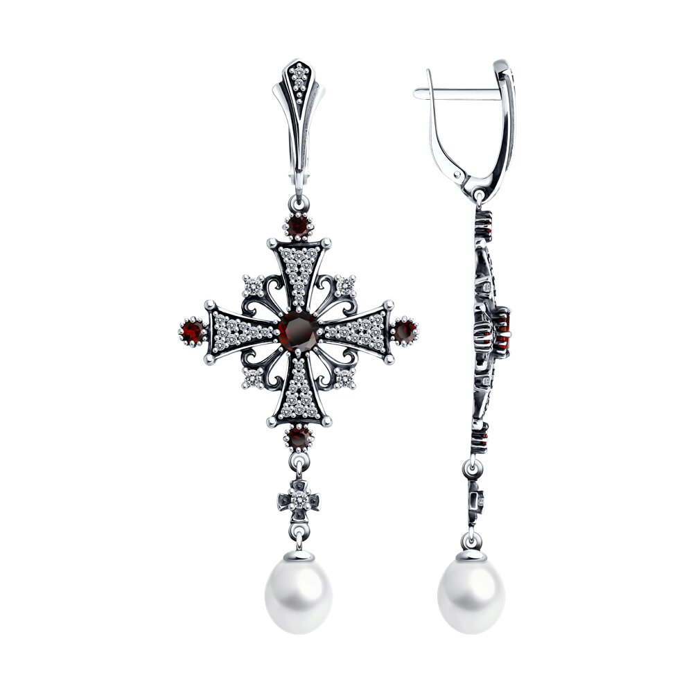 Серьги с жемчугом, гранатом и фианитами из серебра 925 пробы арт. 95-321-02037-1