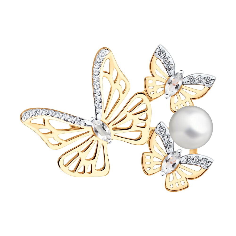 Брошь с жемчугом, горным хрусталем и фианитами из золота 585 пробы арт. 794058