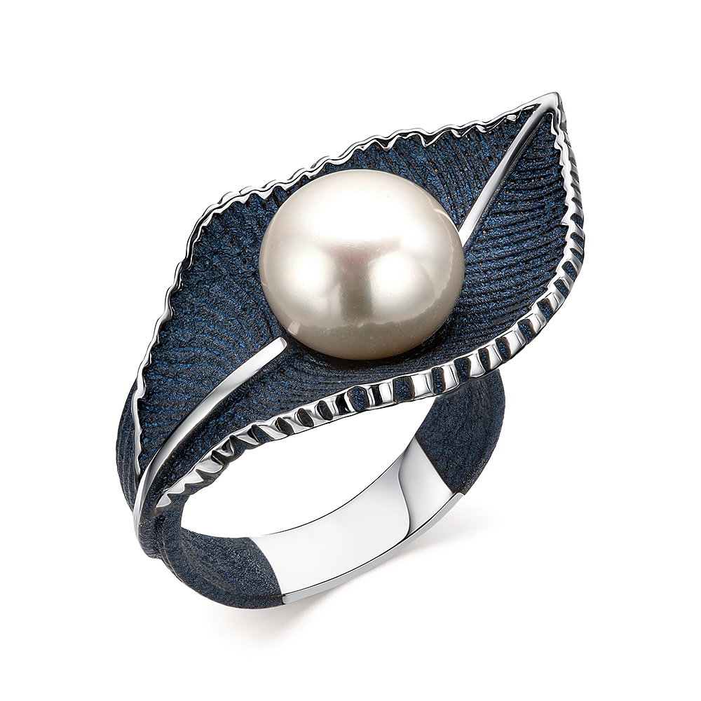 Кольцо "Лист" с жемчугом и эмалью из серебра 925 пробы