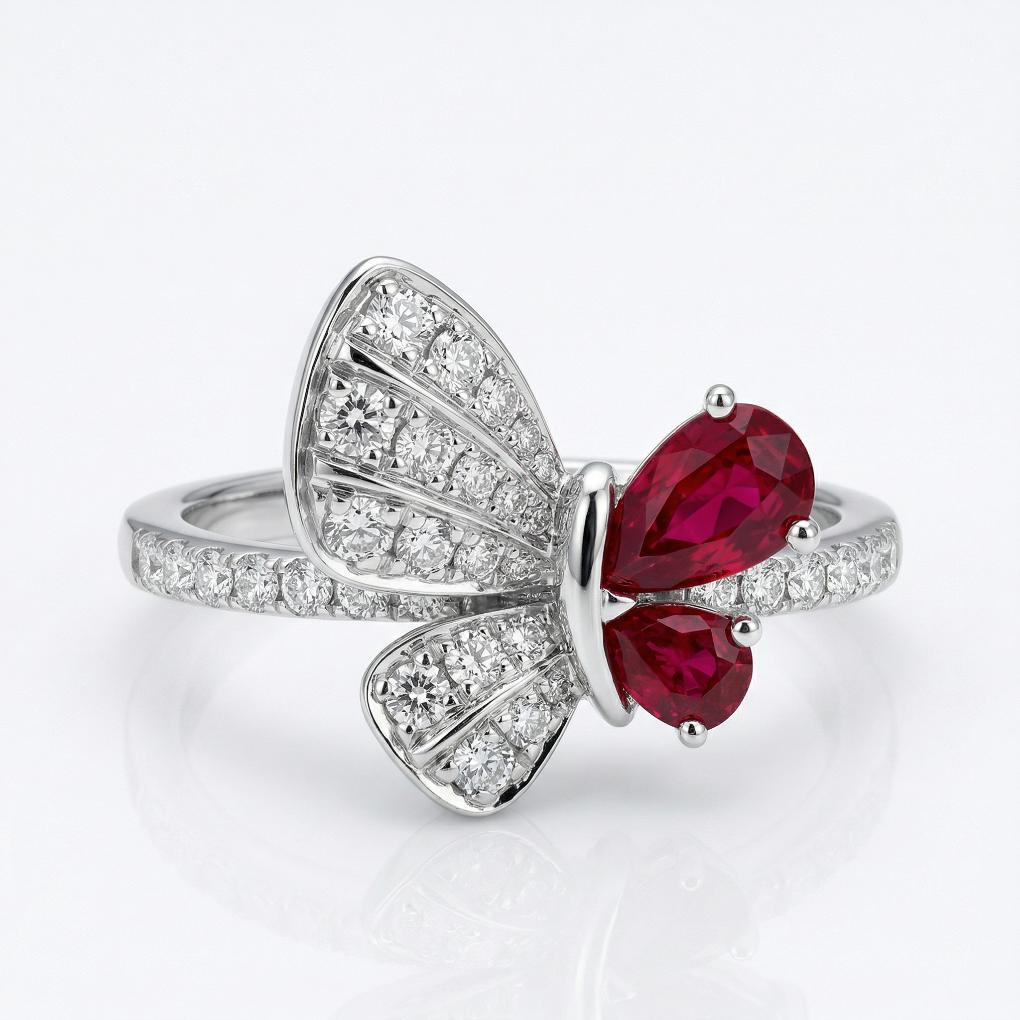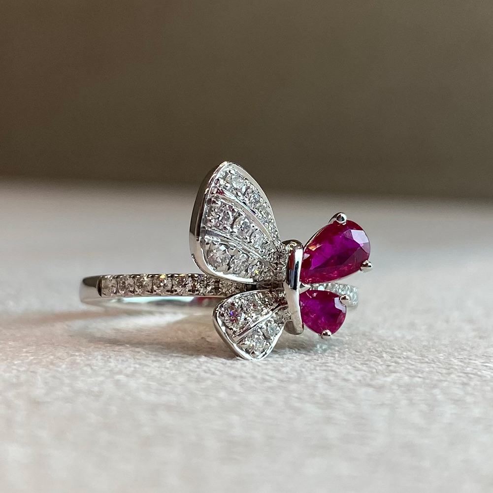 Кольцо "Бабочка" с рубинами и бриллиантами из белого золота 585 пробы