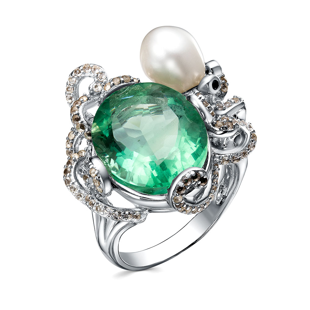 Кольцо с флюоритом, топазами, шпинелью и жемчугом из серебра 925 пробы арт. KR0614_KO_SP_WP_WG
