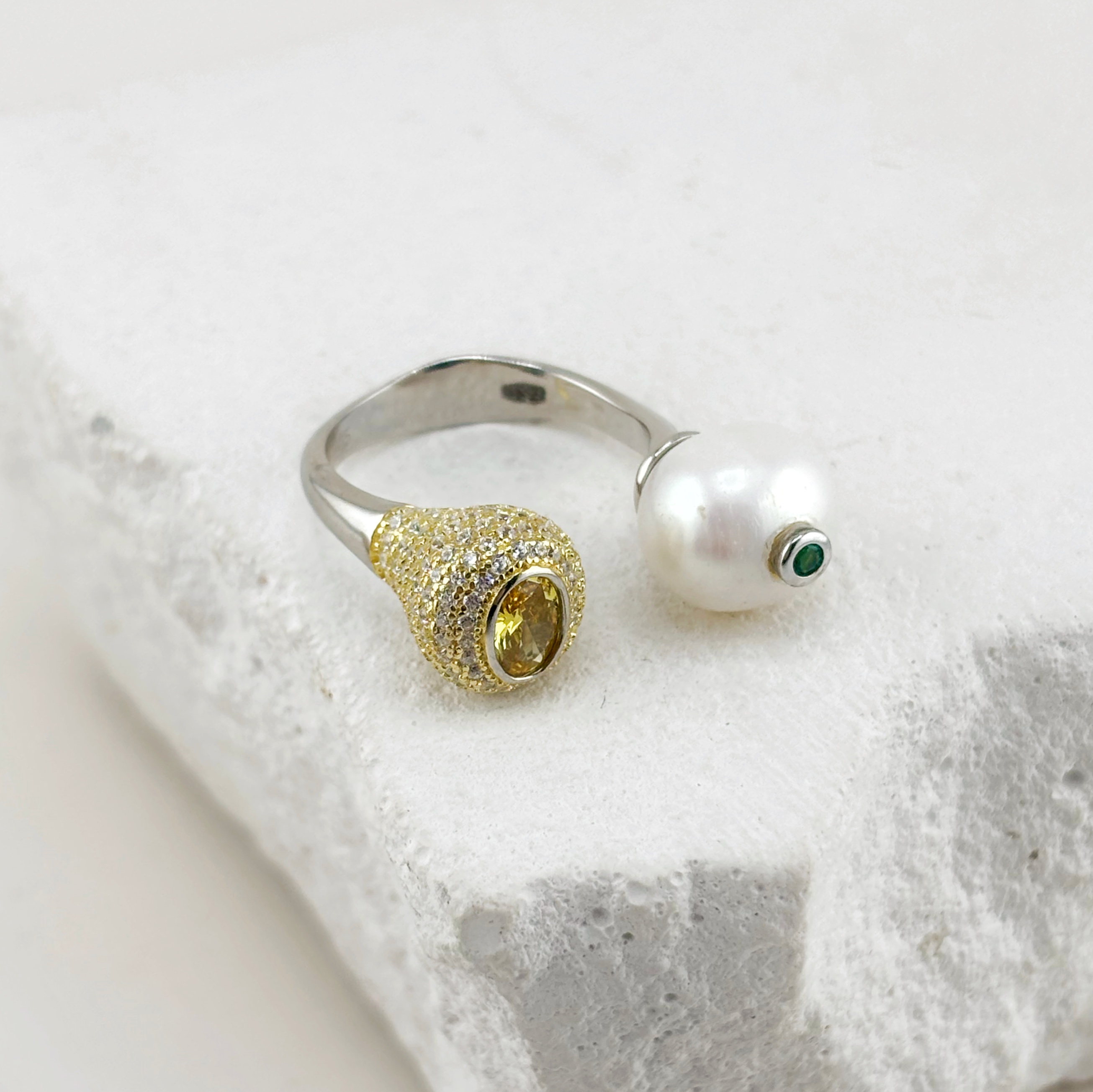 Кольцо с фианитами и жемчугом из серебра 925 пробы с позолотой