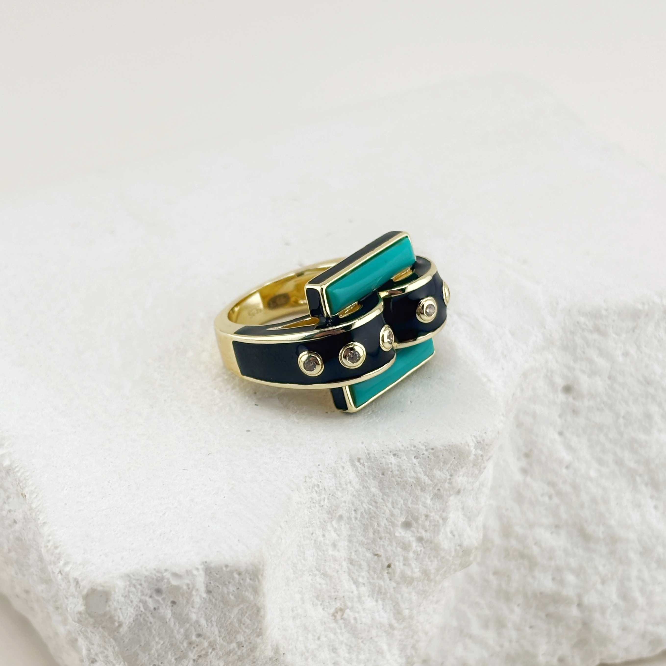 Кольцо с фианитами, бирюзой и эмалью из серебра 925 пробы с позолотой арт. R40710-BY