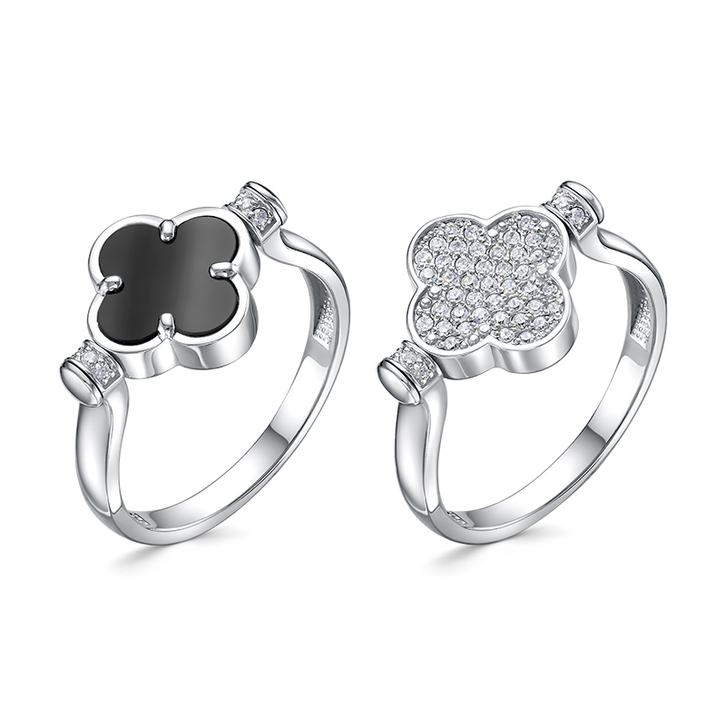 Кольцо "Клевер" с фианитами и ониксом из серебра 925 пробы