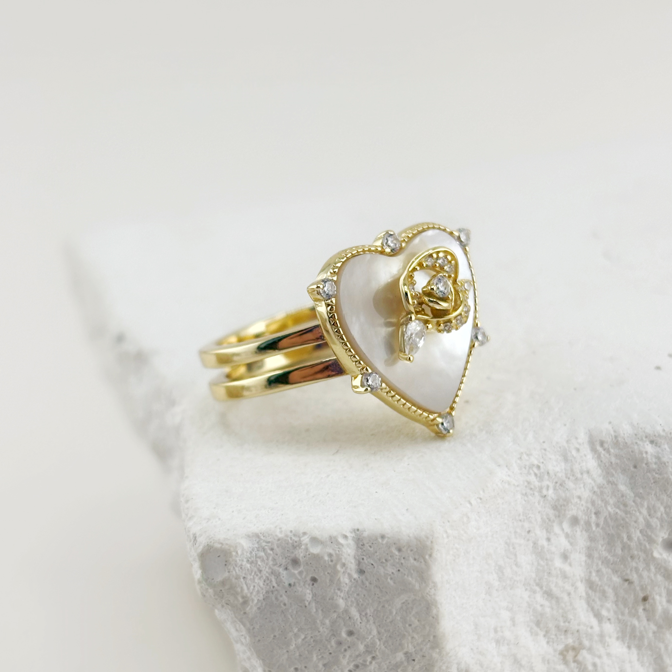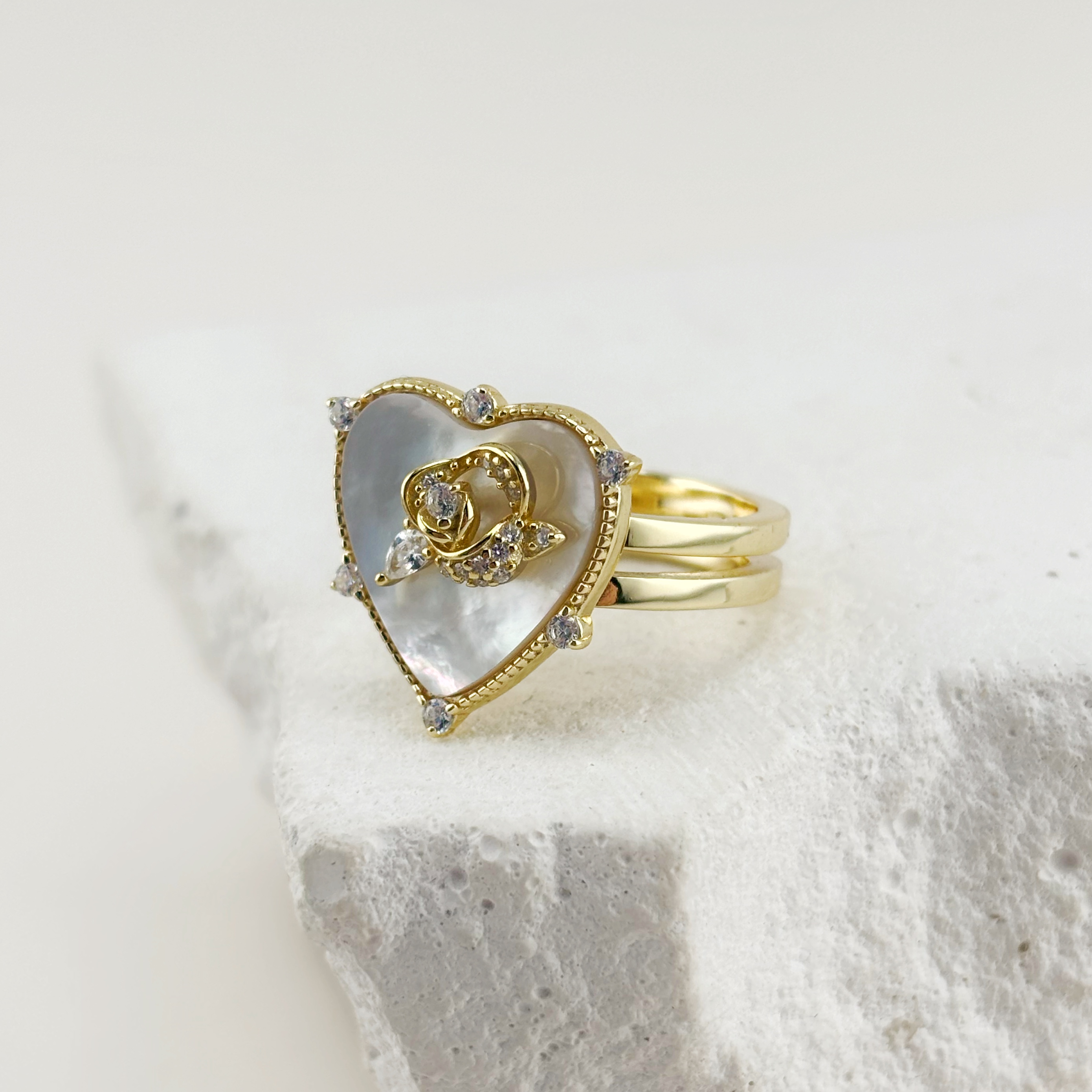 Кольцо "Сердце и цветок" с фианитами и перламутром из серебра 925 пробы с позолотой