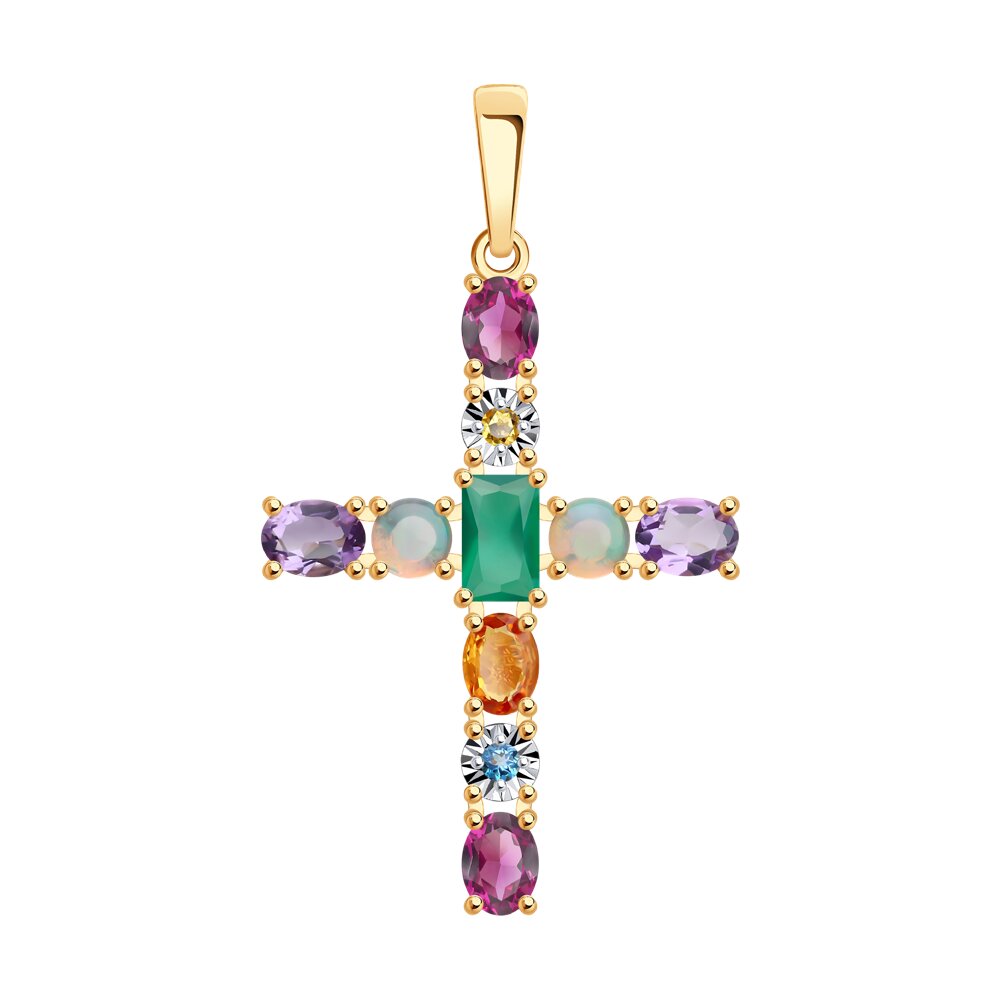 Декоративный крест с агатом, аметистом, опалом, родолитом и сапфиром из золота 585 пробы арт. 732978