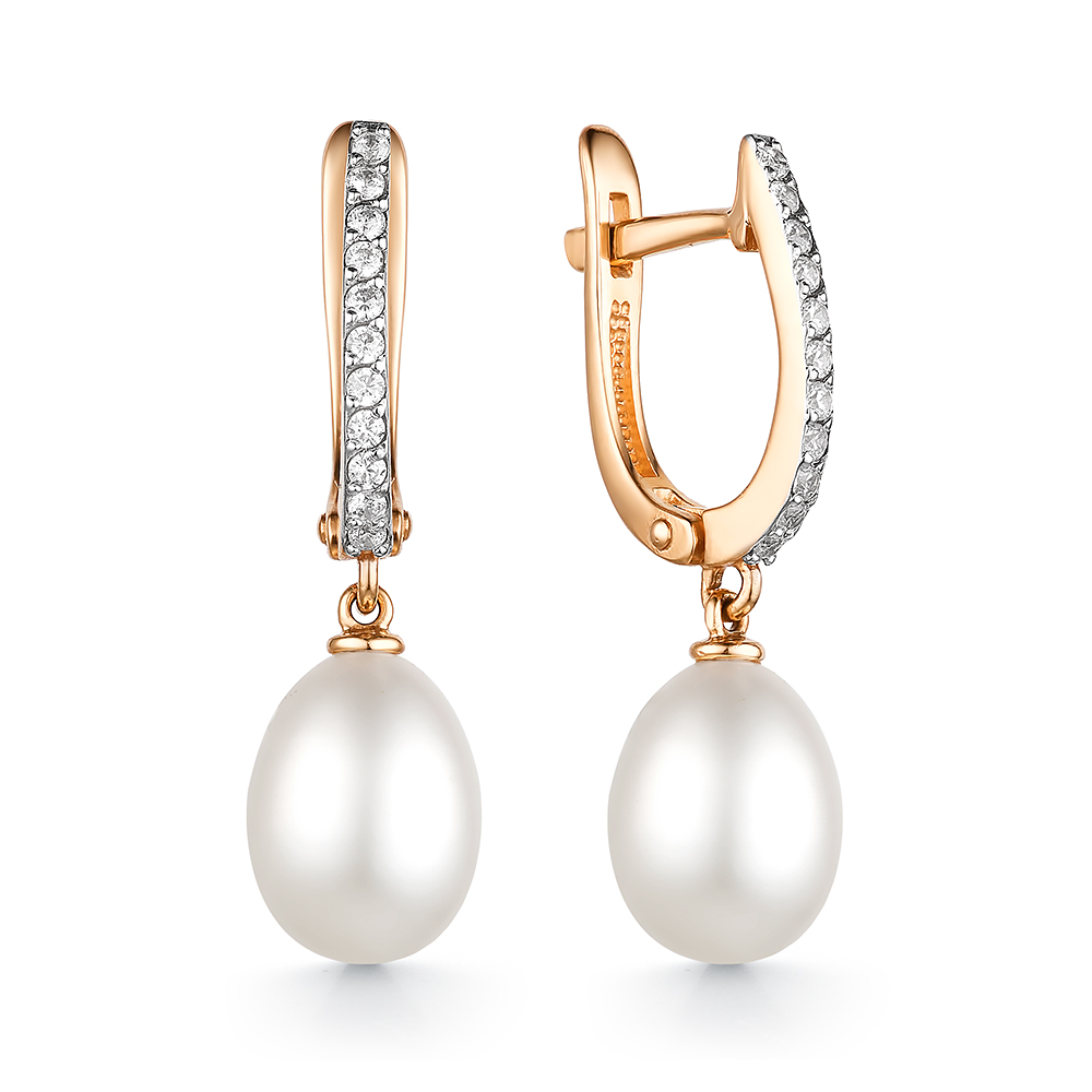 Серьги с жемчугом и фианитами из золота 585 пробы