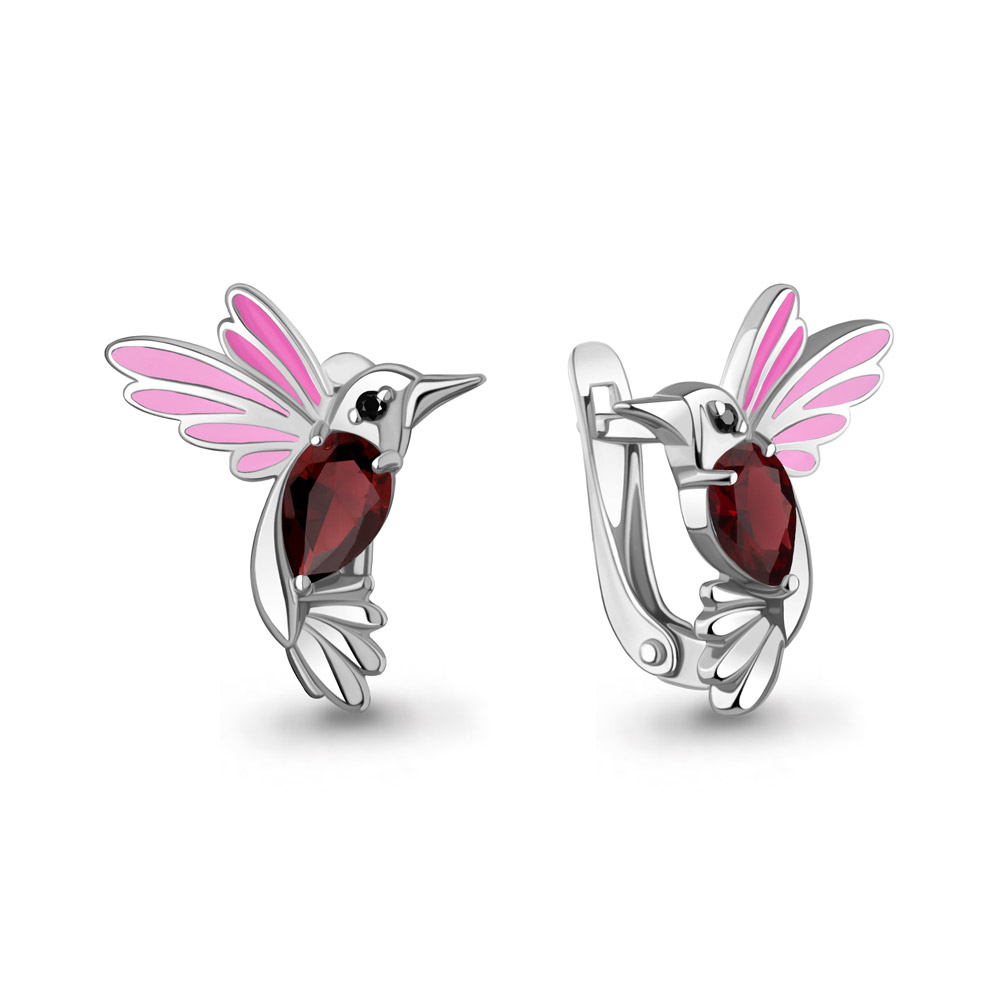 Серьги "Птицы" с гранатами, нанокристаллами и эмалью из серебра 925 пробы арт. 45026803Ч.5