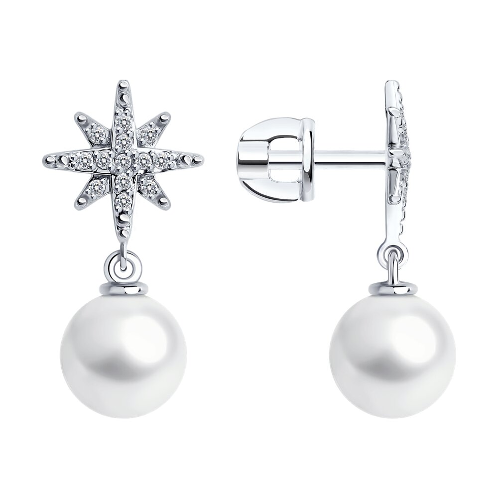 Серьги "Звезды" с жемчугом и бриллиантами из белого золота 585 пробы