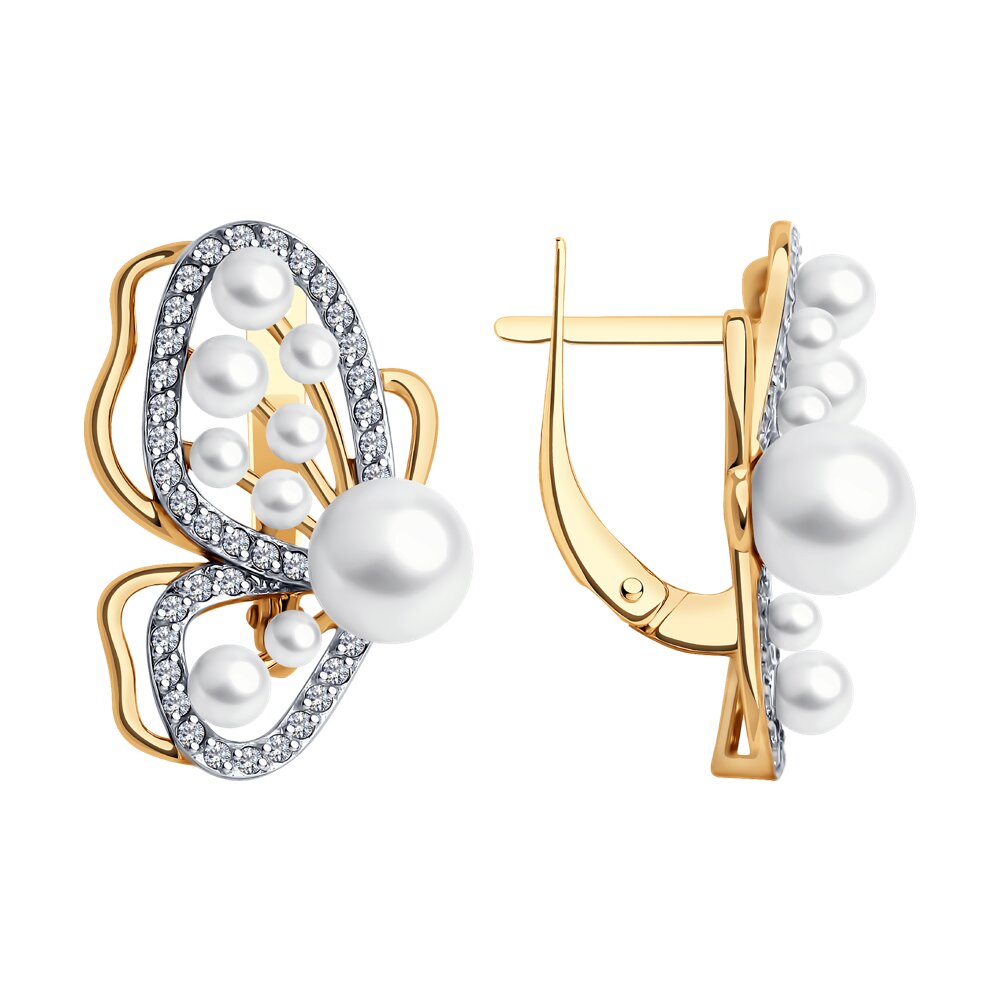 Серьги "Бабочки" с жемчугом и фианитами из золота 585 пробы арт. 792438