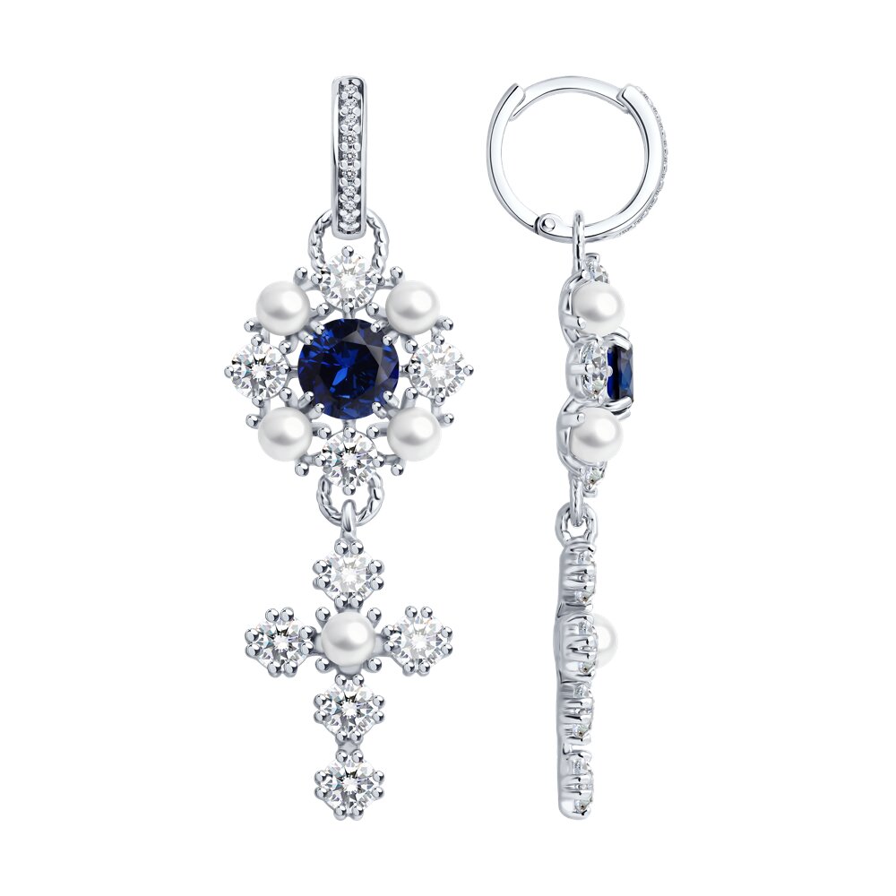 Серьги "Кресты" с жемчугом, корундом и фианитами из серебра 925 пробы арт. 94027323