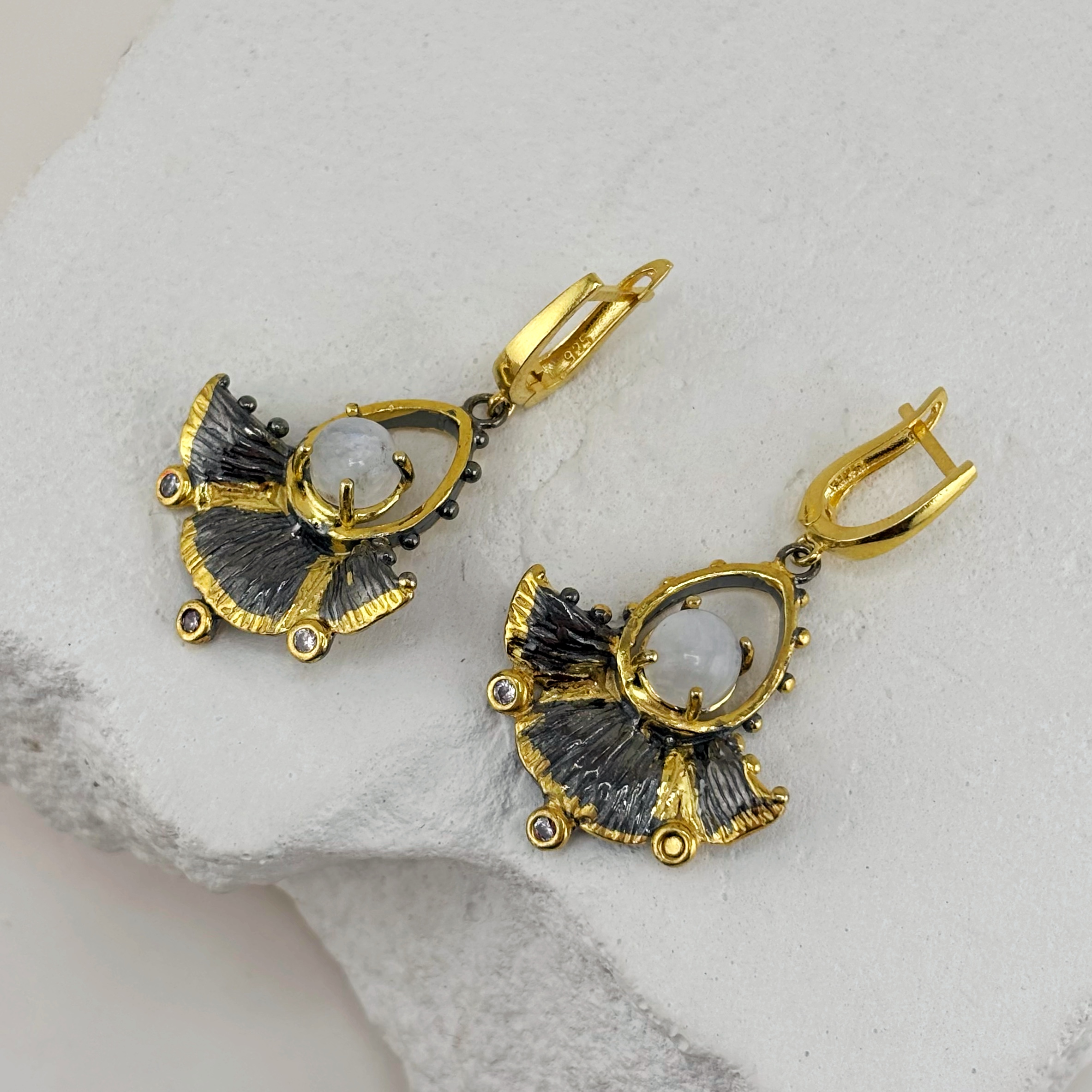 Серьги с фианитами и лунным камнем из серебра 925 пробы с позолотой арт. ER1116