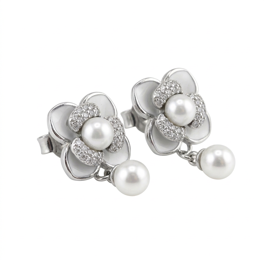 Серьги "Цветы" с жемчугом, фианитами и эмалью из серебра 925 пробы арт. ER1162