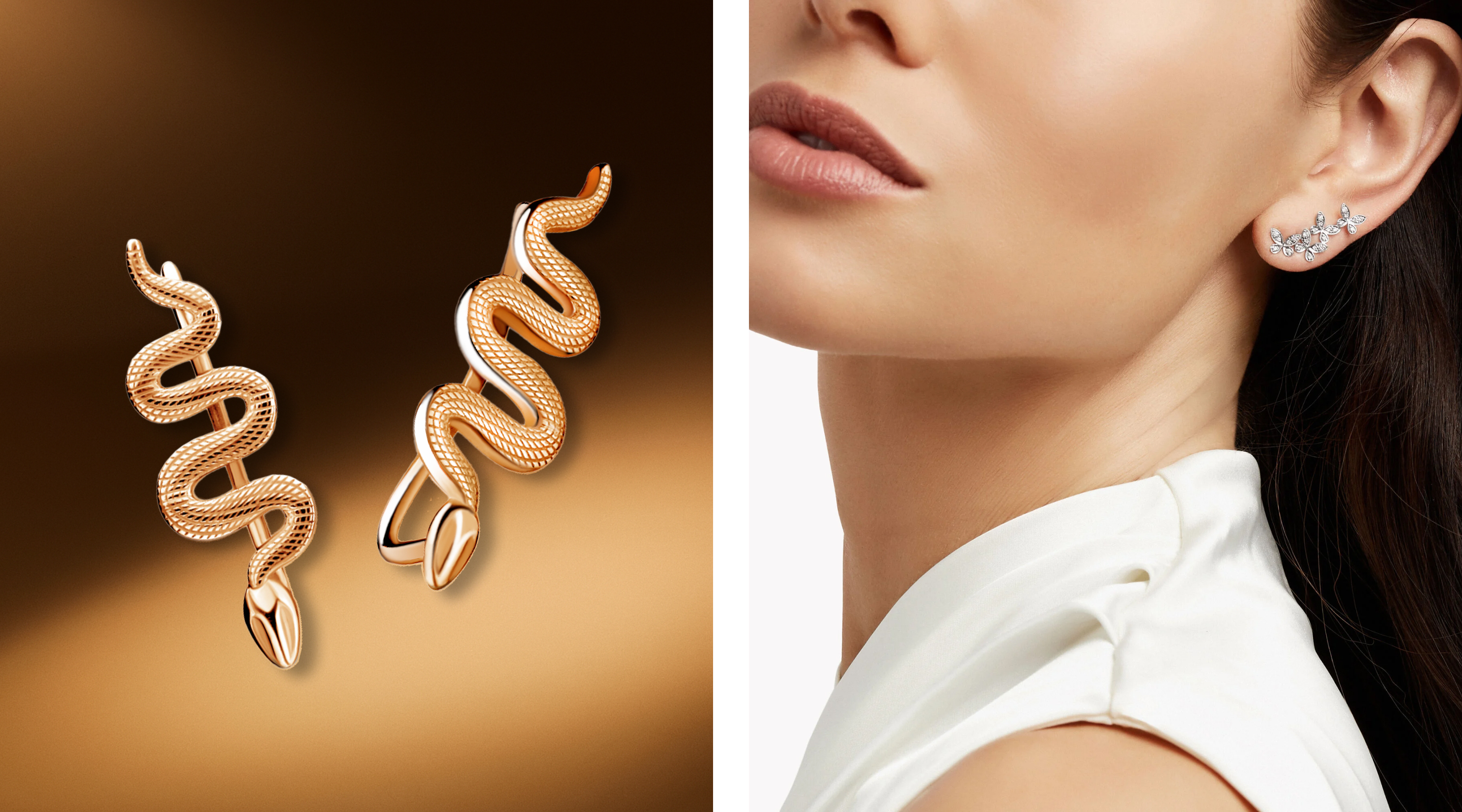 Клаймберы — имеют такое название не просто так, оно образуется от англ. слова climb, — взбираться, подниматься. Модели серег-клаймберов крепятся на мочке с помощью гвоздика, а выше на ушке фиксируется зажимом.