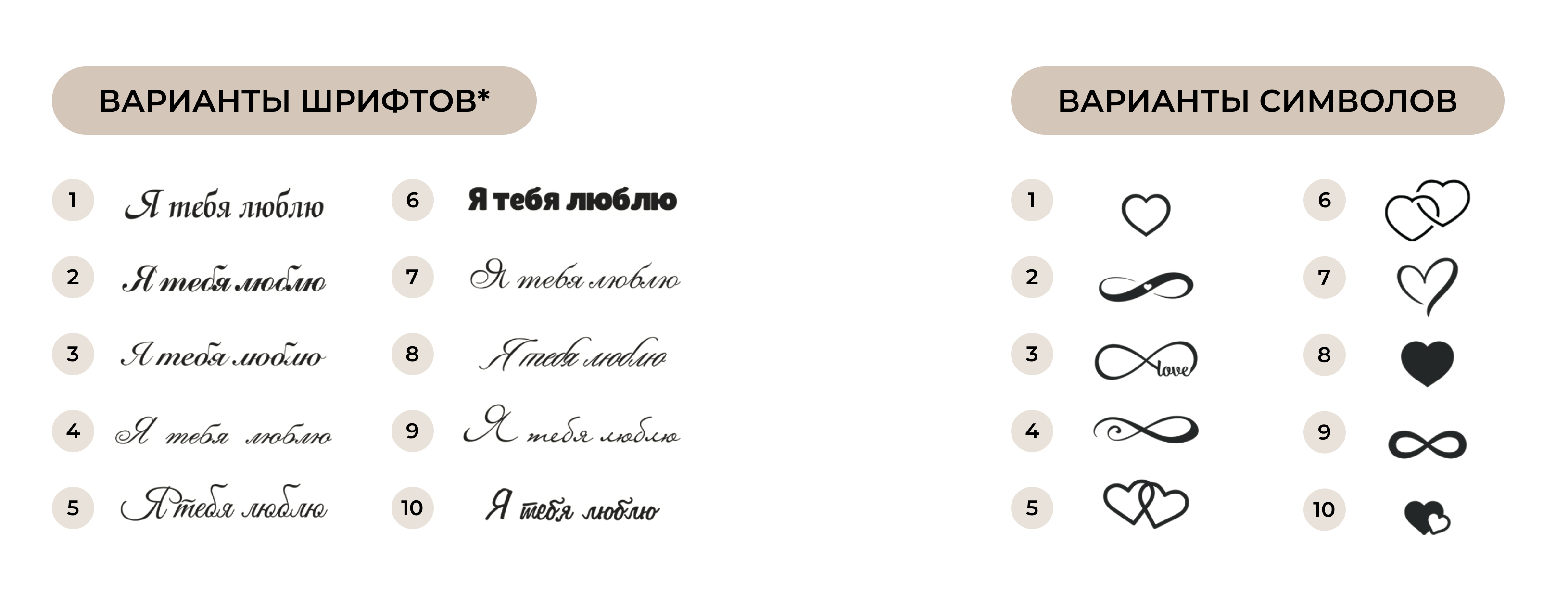 Слова признания или пожелания: «Навсегда», «Вместе навек», «Союз сердец».