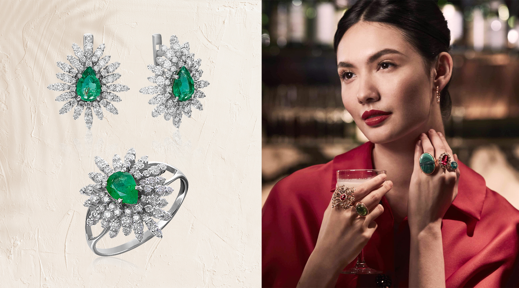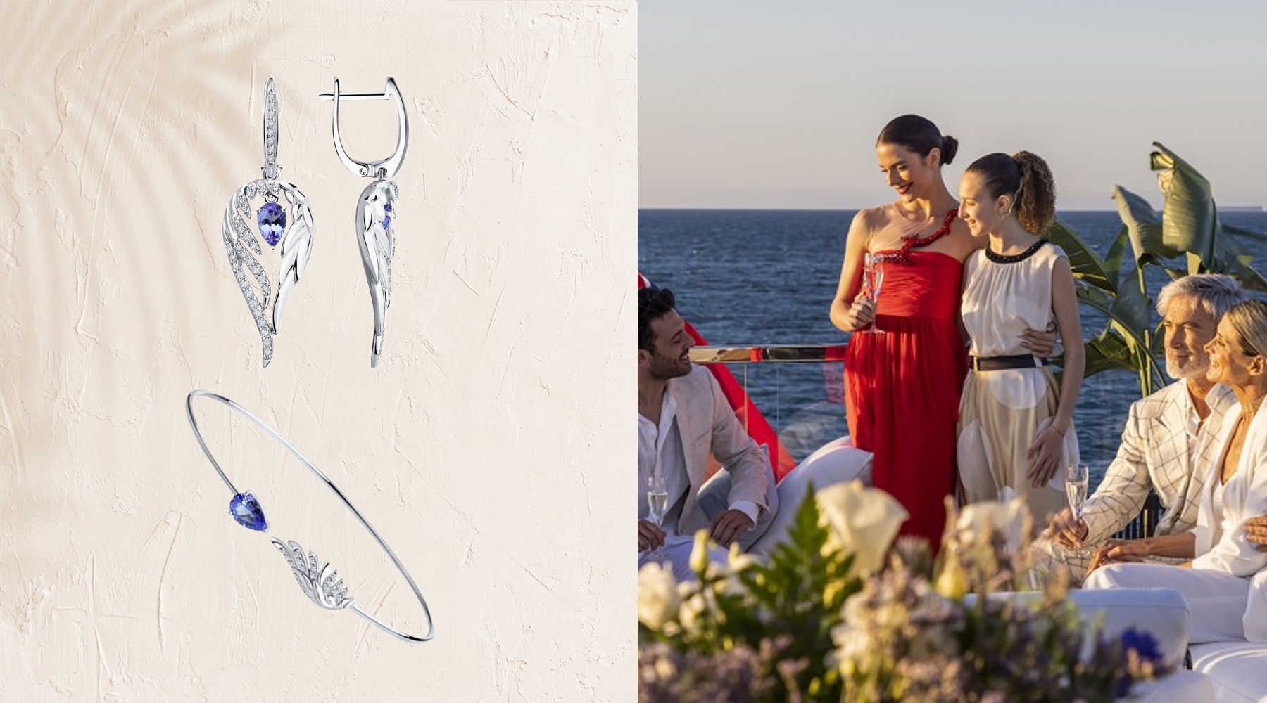 Легкий бриз и прекрасный закат с бокалом шампанского в руке. Роскошный отдых достойный лучших украшений. Отдайте предпочтение серьгам и кольцам с бриллиантами, которые станут эффектным завершающим штрихом к лаконичному вечернему платью.