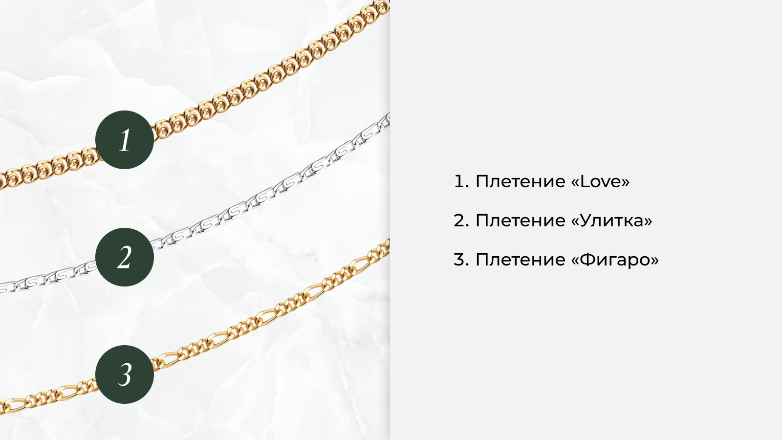 При выборе плетения цепочки стоит ориентироваться на свой вкус и стиль. Важно решить, из какого драгоценного металла вы выберите цепочку: красного, белого или желтого золота, серебра или серебра с позолотой? Ориентируйтесь на украшения и подвески, которые уже есть в вашей коллекции, чтобы подобрать идеальные сочетания.